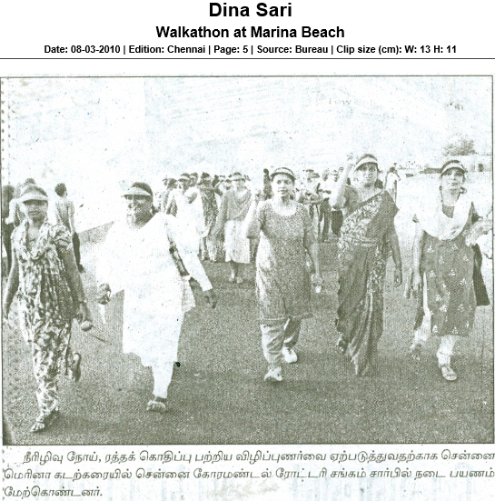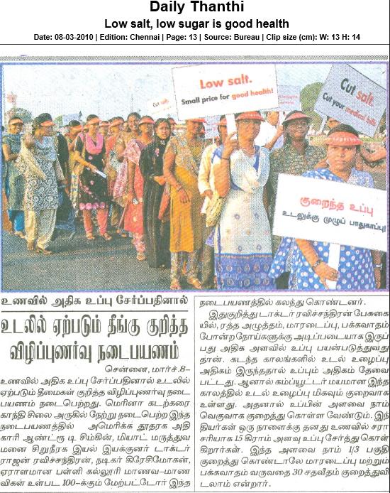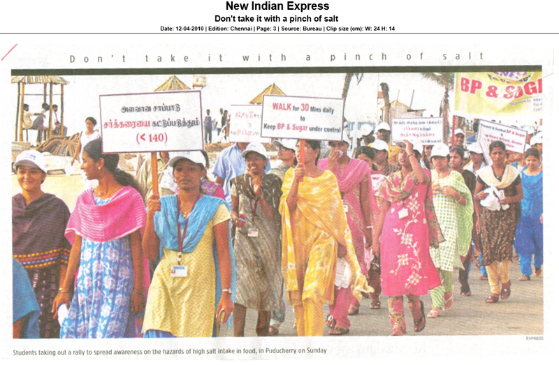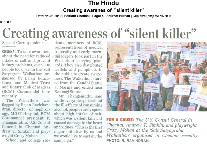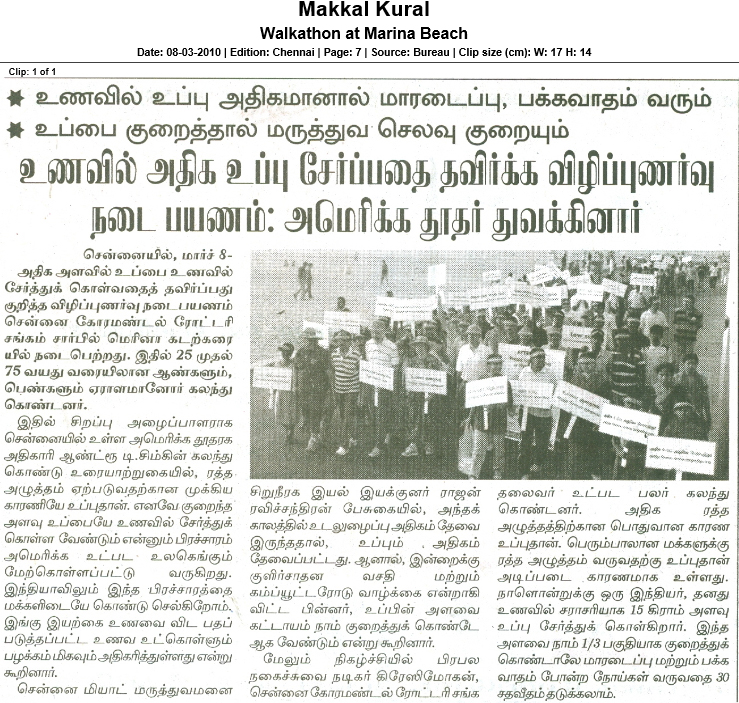 A walkathon lead by Dr. Rajan Ravichandran was organised on 7th March 2010 at Marina beach, Chennai. Renowned playwright and comedian Crazy Mohan and US Consul General Andrew T.Simkin also participated. A large crowd joined the walkathon to support the salt reduction campaign.