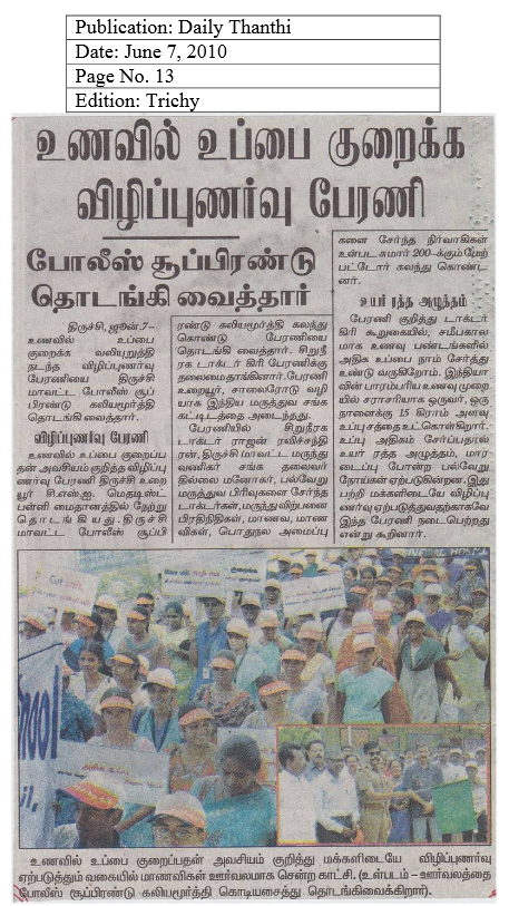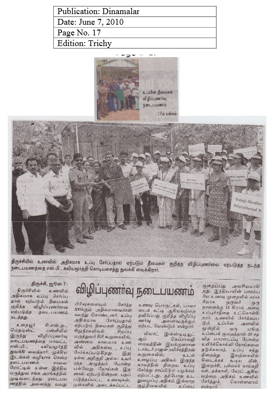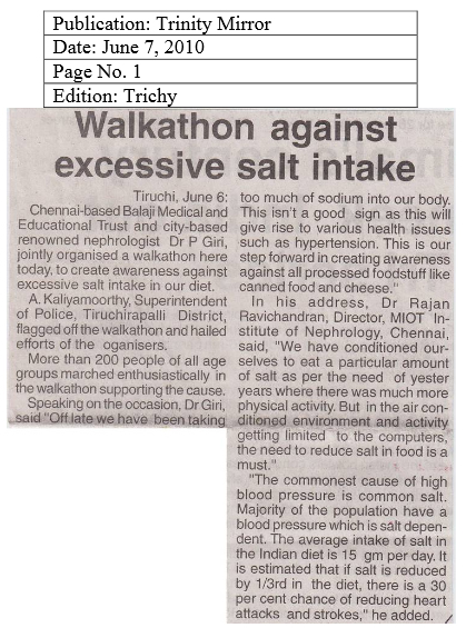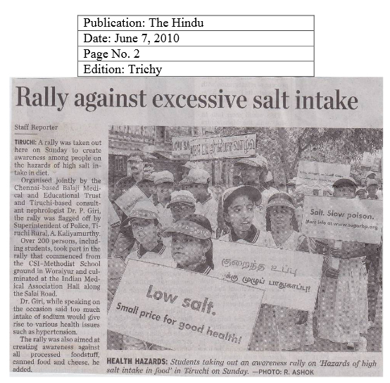 A rally was taken out at Tiruchirapalli (Tiruchi) on 6th June 2010 to create awareness among people on the hazards of high salt intake in diet. Organized jointly by the Chennai-based Balaji Medical and Educational Trust/sugarbp.org and Tiruchi-based renowned consultant nephrologist Dr.P.Giri. Over 200 persons, including students, took part in the rally that commenced from the CSI-Methodist School and culminated at the IMA Hall.