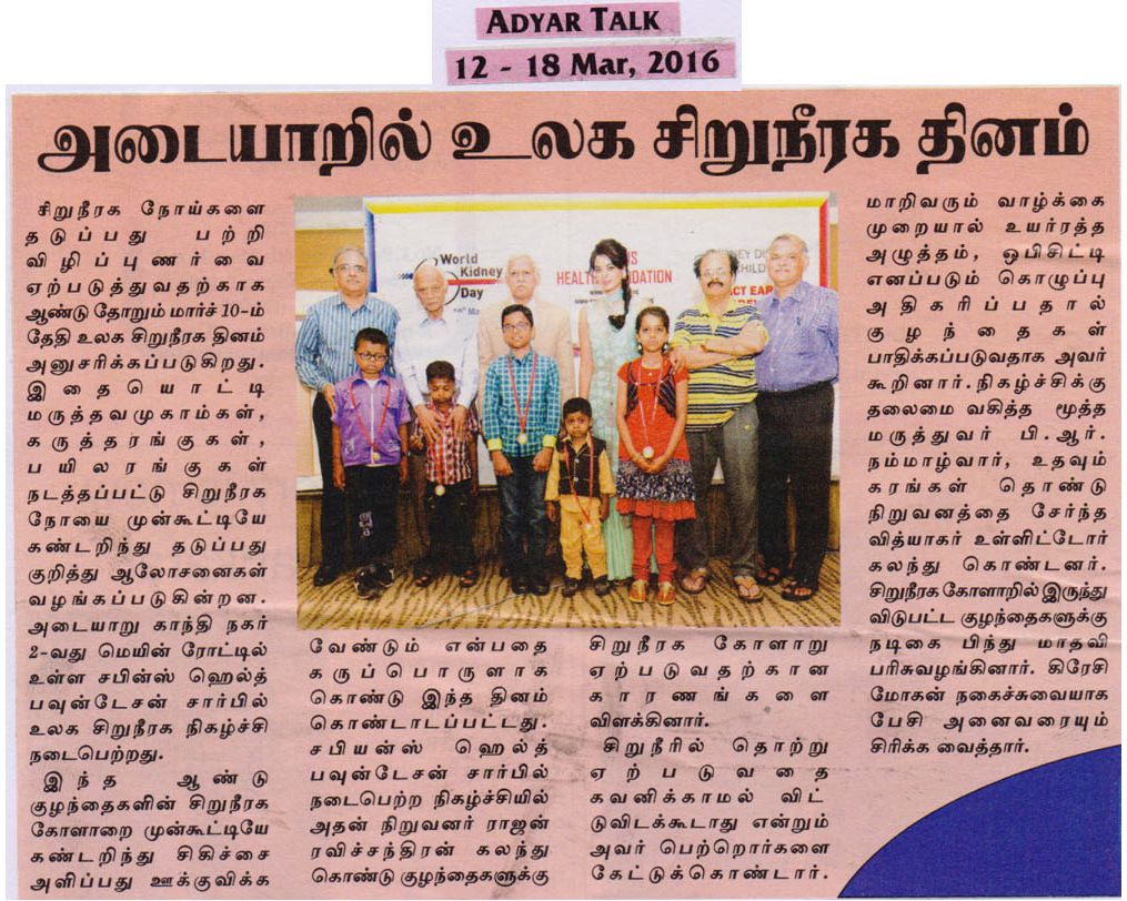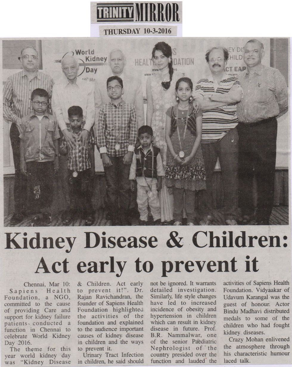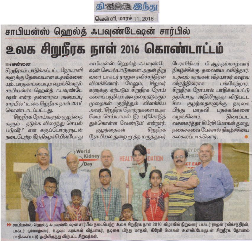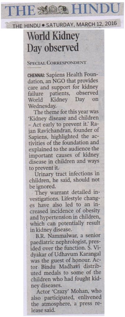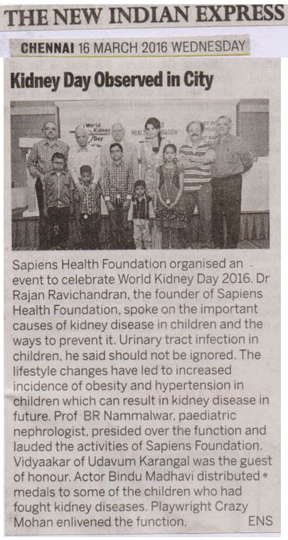 SAPIENS HEALTH FOUNDATION a NGO committed to the cause of providing Care and support for kidney failure patients conducted a function in Chennai to celebrate World Kidney Day 2016. The theme for this year world kidney day was “Kidney Disease & Children. Act early to prevent it!”. Dr. Rajan Ravichandran, the founder of Sapiens Health Foundation highlighted the activities of the foundation and explainedto the audience important causes of kidney disease in children and the ways to prevent it. Urinary Tract Infection in children, he said should not be ignored. It warrants detailed investigation. Similarly , life style changes has led to increased incidence of obesity and hypertension in children which can result in kidney disease in future. Prof. B.R. Nammalwar, one of the senior paediatric nephrologist of the country presided over the function and lauded the activities of Sapiens Health Foundation. Mr. Vidyaakar of Udavum Karangal was the guest of honour. Actor Bindu madhavi distributed medals to some of the children who had fought kidney diseases. Crazy Mohan enlivened the atmosphere through his characteristic humour laced talk.