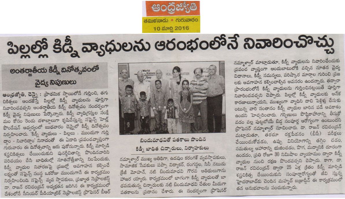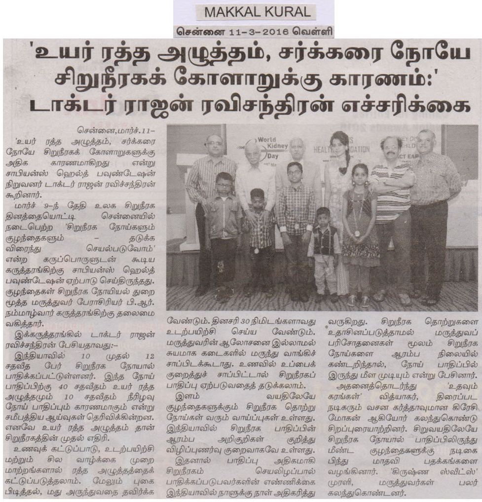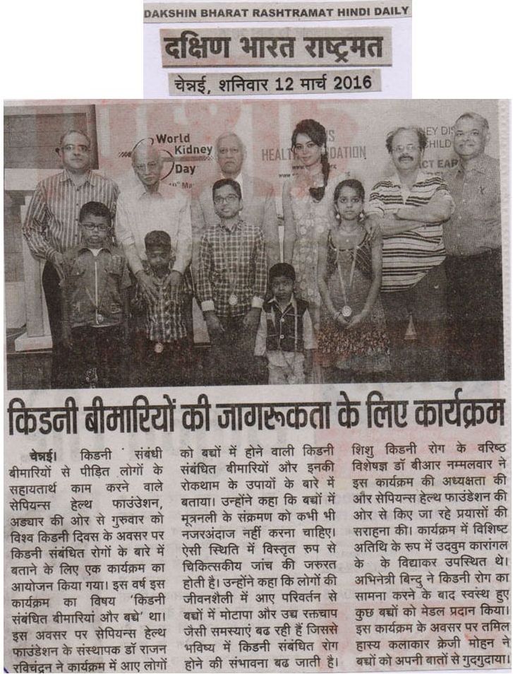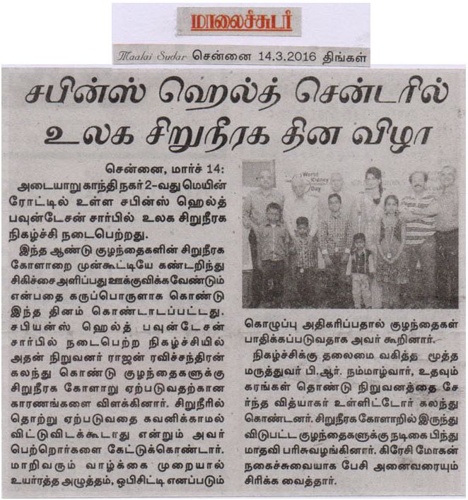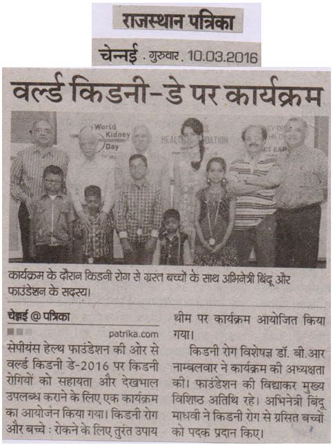 SAPIENS HEALTH FOUNDATION a NGO committed to the cause of providing Care and support for kidney failure patients conducted a function in Chennai to celebrate World Kidney Day 2016. The theme for this year world kidney day was “Kidney Disease & Children. Act early to prevent it!”. Dr. Rajan Ravichandran, the founder of Sapiens Health Foundation highlighted the activities of the foundation and explainedto the audience important causes of kidney disease in children and the ways to prevent it. Urinary Tract Infection in children, he said should not be ignored. It warrants detailed investigation. Similarly , life style changes has led to increased incidence of obesity and hypertension in children which can result in kidney disease in future. Prof. B.R. Nammalwar, one of the senior paediatric nephrologist of the country presided over the function and lauded the activities of Sapiens Health Foundation. Mr. Vidyaakar of Udavum Karangal was the guest of honour. Actor Bindu madhavi distributed medals to some of the children who had fought kidney diseases. Crazy Mohan enlivened the atmosphere through his characteristic humour laced talk.
