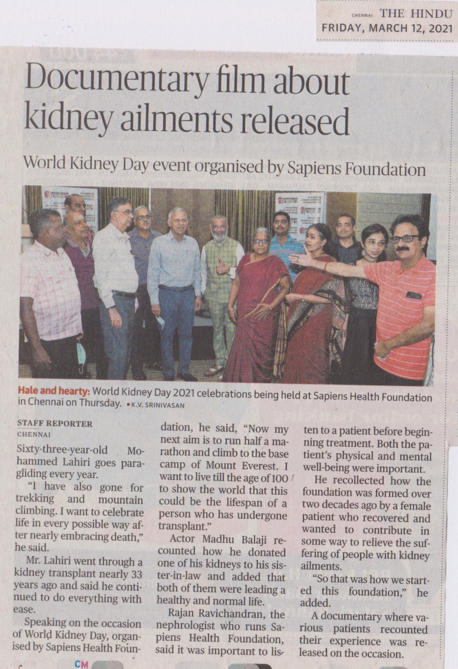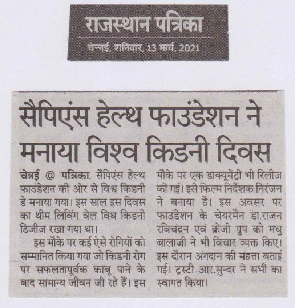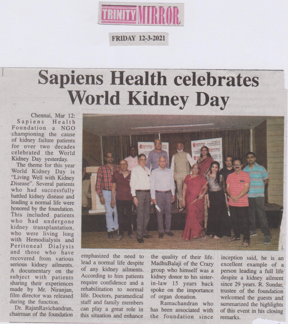 Sapiens Health Foundation a NGO championing the cause of kidney failure patients for over two decades celebrated the World Kidney Day on March 11th 2021. The theme for this year World Kidney Day is “Living Well with Kidney Disease”. Several patients who had successfully battled kidney disease and leading a normal life were honored by the foundation. This included patients who had undergone kidney transplantation, who were living long with Hemodialysis and Peritoneal Dialysis and those who have recovered from various serious kidney ailments. A documentary on the subject with patients sharing their experiences made by Mr. Niranjan, film director was released during the function. Dr. Rajan Ravichandran, chairman of the foundation emphasized the need to lead a normal life despite of any kidney ailments. According to him patients require confidence and a rehabilitation to normal life. Doctors, paramedical staff and family members can play a great role in this situation and enhance the quality of their life. Madhu Balaji of the Crazy group who himself was a kidney donor to his sister-in-law 15 years back spoke on the importance of organ donation. Mr. Ramachandran who has been associated with the foundation since inception said, he is an excellent example of a person leading a full life despite a kidney ailment since 29 years. Mr. R. Sundar, trustee of the foundation welcomed the guests and summarized the highlights of this event in his closing remarks.