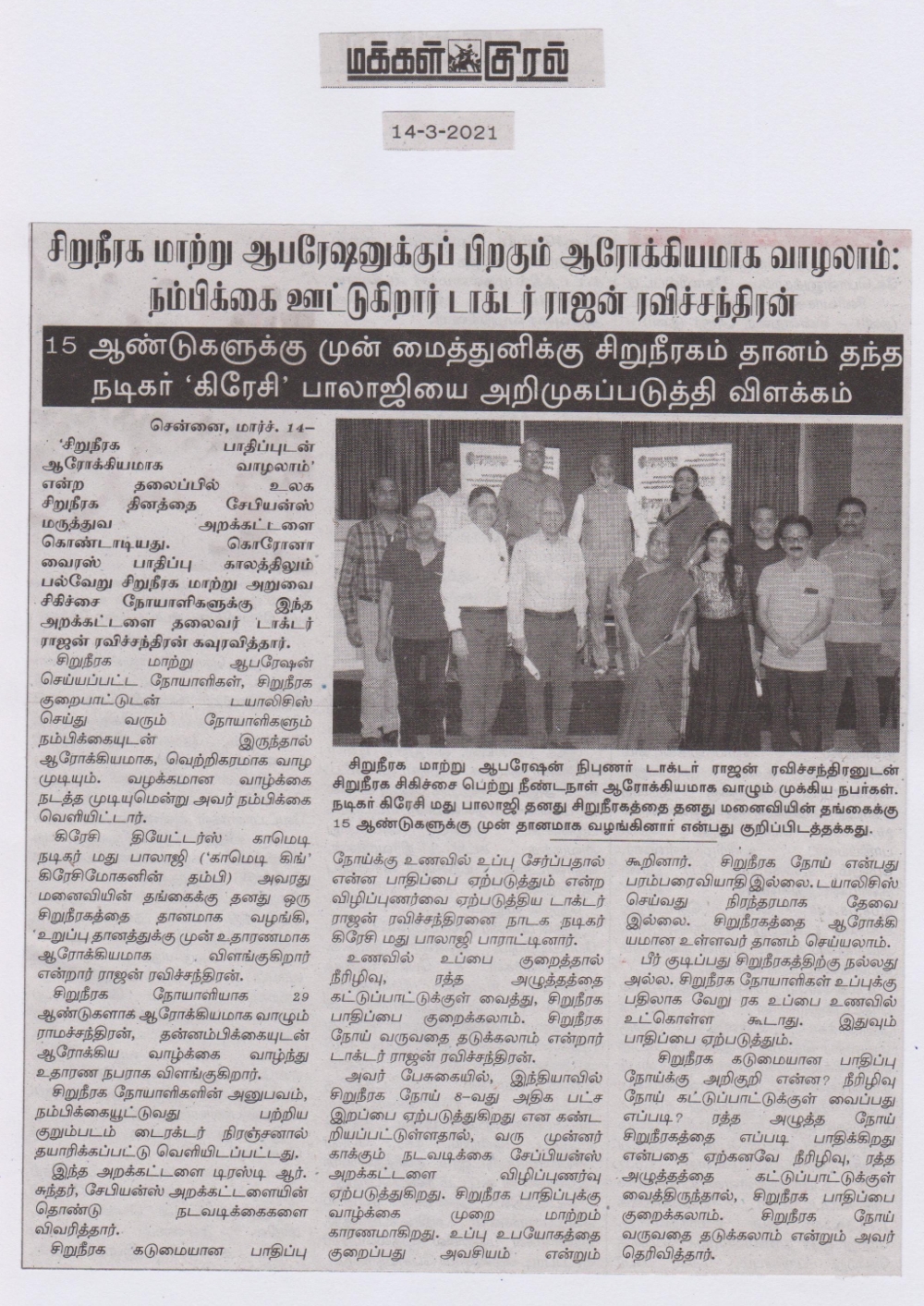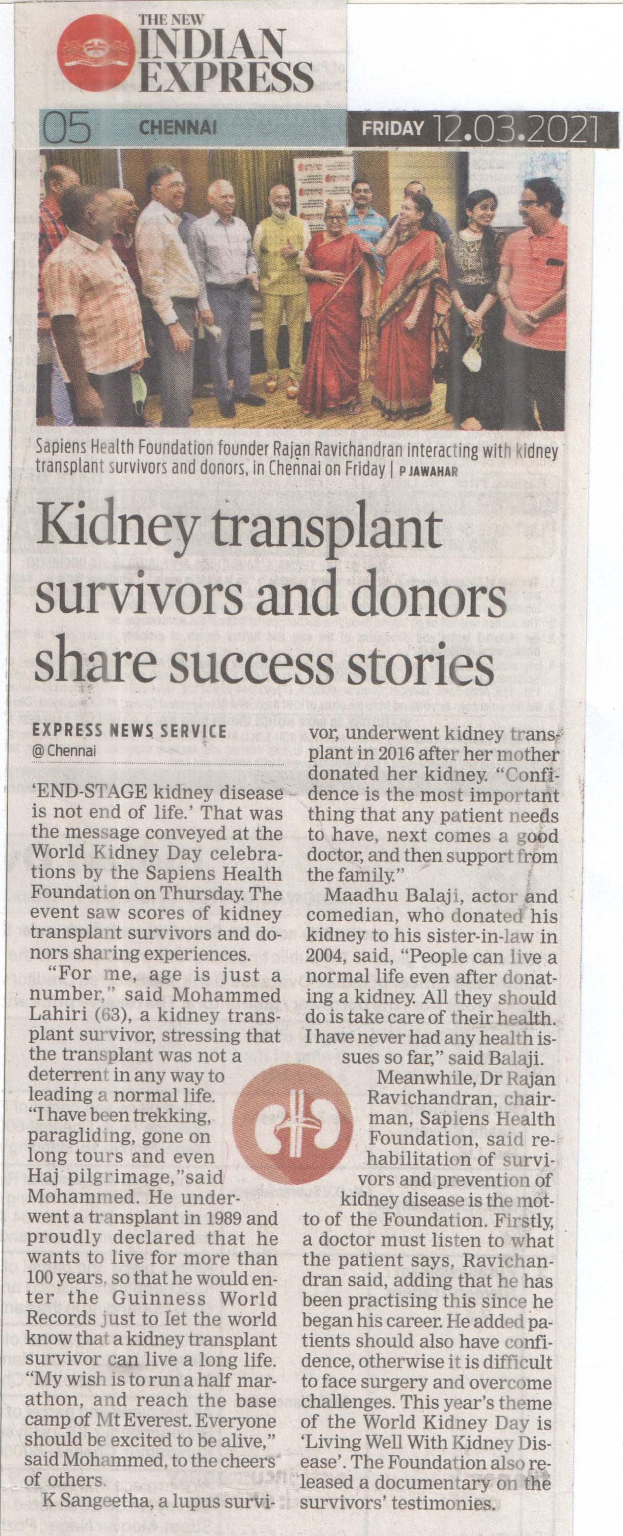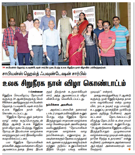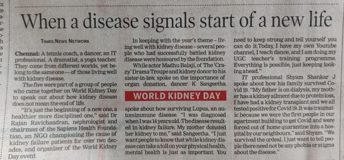 Sapiens Health Foundation a NGO championing the cause of kidney failure patients for over two decades celebrated the World Kidney Day on March 11th 2021. The theme for this year World Kidney Day is “Living Well with Kidney Disease”. Several patients who had successfully battled kidney disease and leading a normal life were honored by the foundation. This included patients who had undergone kidney transplantation, who were living long with Hemodialysis and Peritoneal Dialysis and those who have recovered from various serious kidney ailments. A documentary on the subject with patients sharing their experiences made by Mr. Niranjan, film director was released during the function. Dr. Rajan Ravichandran, chairman of the foundation emphasized the need to lead a normal life despite of any kidney ailments. According to him patients require confidence and a rehabilitation to normal life. Doctors, paramedical staff and family members can play a great role in this situation and enhance the quality of their life. Madhu Balaji of the Crazy group who himself was a kidney donor to his sister-in-law 15 years back spoke on the importance of organ donation. Mr. Ramachandran who has been associated with the foundation since inception said, he is an excellent example of a person leading a full life despite a kidney ailment since 29 years. Mr. R. Sundar, trustee of the foundation welcomed the guests and summarized the highlights of this event in his closing remarks.