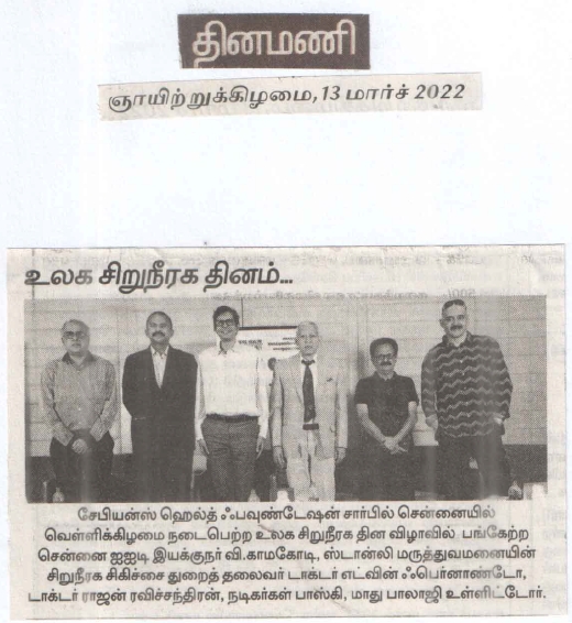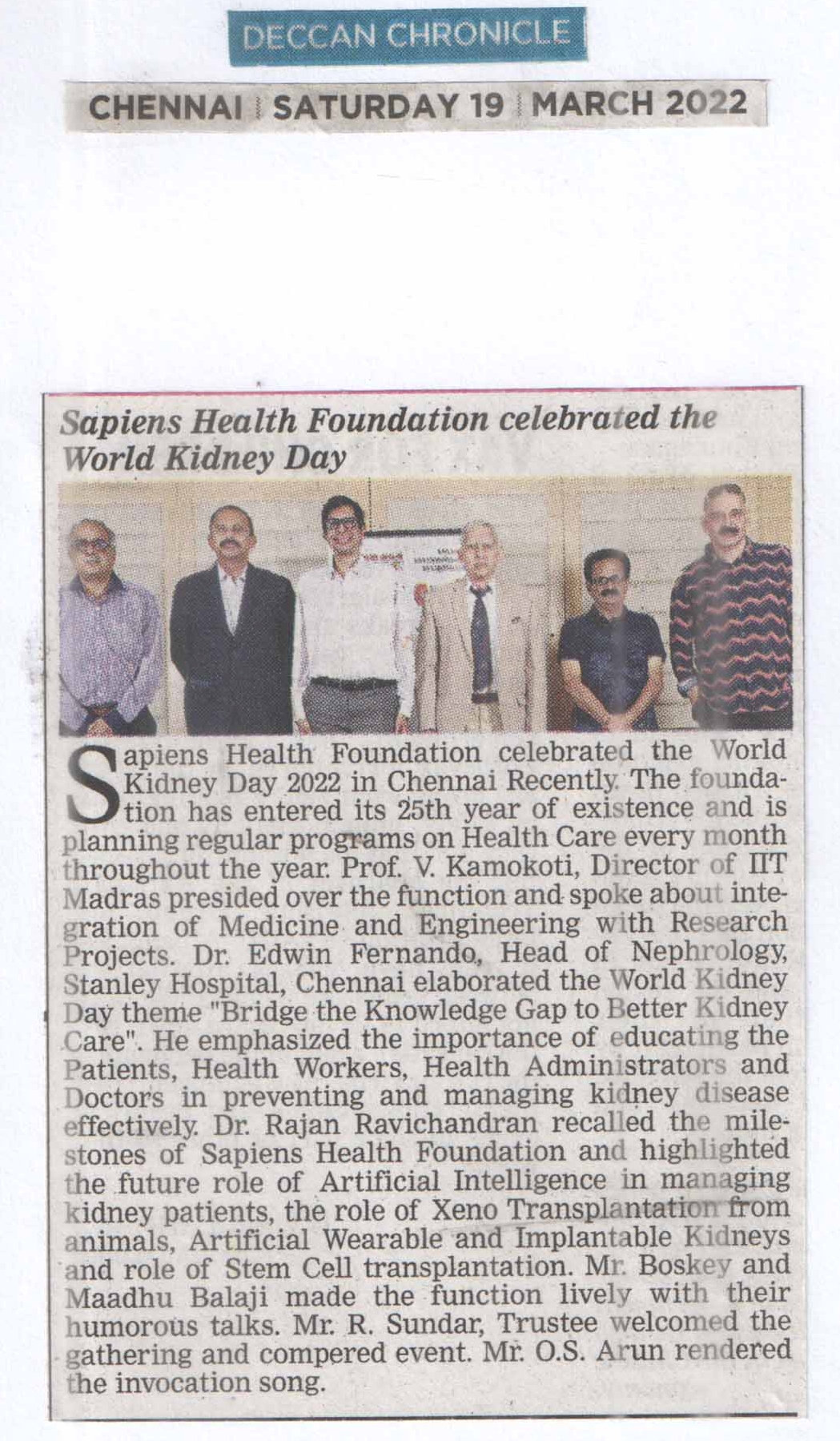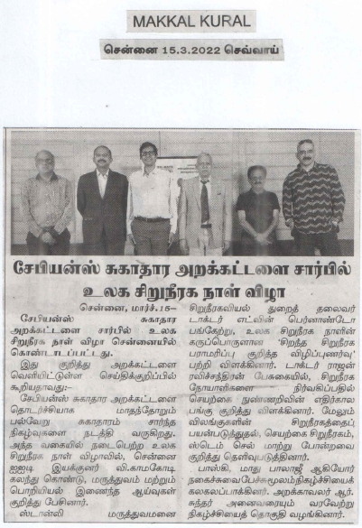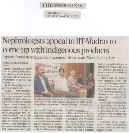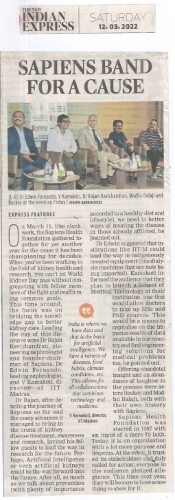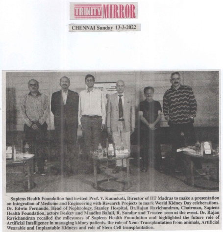 Sapiens Health Foundation celebrated the World Kidney Day 2022 in Chennai on Friday, 11th March. The foundation has entered its 25th year of existence and is planning regular programs on Health Care every month throughout the year. Prof. V. Kamokoti, Director of IIT Madras presided over the function and spoke about integration of Medicine and Engineering with Research Projects. Dr. Edwin Fernando, Head of Nephrology, Stanley Hospital, Chennai elaborated the World Kidney Day theme “Bridge the Knowledge Gap to Better Kidney Care”. He emphasized the importance of educating the Patients, Health Workers, Health Administrators and Doctors in preventing and managing kidney disease effectively. Dr. Rajan Ravichandran recalled the milestones of Sapiens Health Foundation and highlighted the future role of Artificial Intelligence in managing kidney patients, the role of Xeno Transplantation from animals, Artificial Wearable and Implantable Kidneys and role of Stem Cell transplantation. Mr. Boskey and Maadhu Balaji made the function lively with their humorous talks. Mr. R. Sundar, Trustee welcomed the gathering and compered event. Mr. O.S. Arun rendered the invocation song.